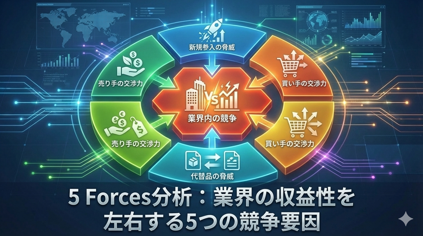 「市場・競争の診断(Strategy & Market Diagnosis)」において、自社を取りまく外部環境の構造的魅力を評価し、収益の源泉を特定するためのフレームワークです。