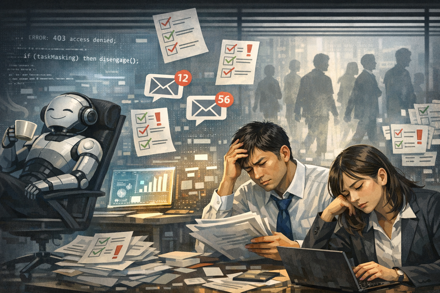 ここに生成AIとリモート/ハイブリッドが重なると、組織の“設計不備”が一気に露呈します。生成AIは、知的生産のうち「調査・整理・草案・量産」といった0/1化しやすい工程を圧縮します。これは本来、余力創出に効く。しかし評価やマネジメントが アウトカム(成果)ではなくインプット(作業量・稼働感) に寄ったままだと、合理的な振る舞いは「短時間で成果に近づく」ではなく「忙しさを演出し続ける」になります。いわゆる“task masking”は、優先度の低い活動で生産性を装う行為として説明されています。peoplemanagement.co.uk