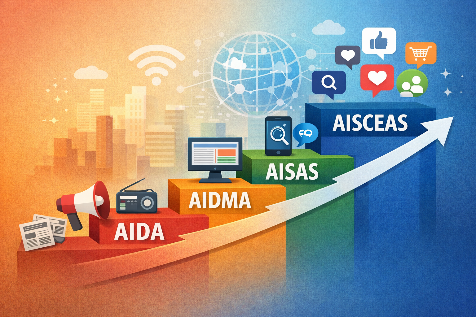 「ファネル/購買行動(Funnel & Consumer Behavior Models)」の中で、AIDA/AIDMA/AISAS/AISCEASは“メディア環境の変化を、購買プロセスの言葉に翻訳する”ための代表的モデルです。