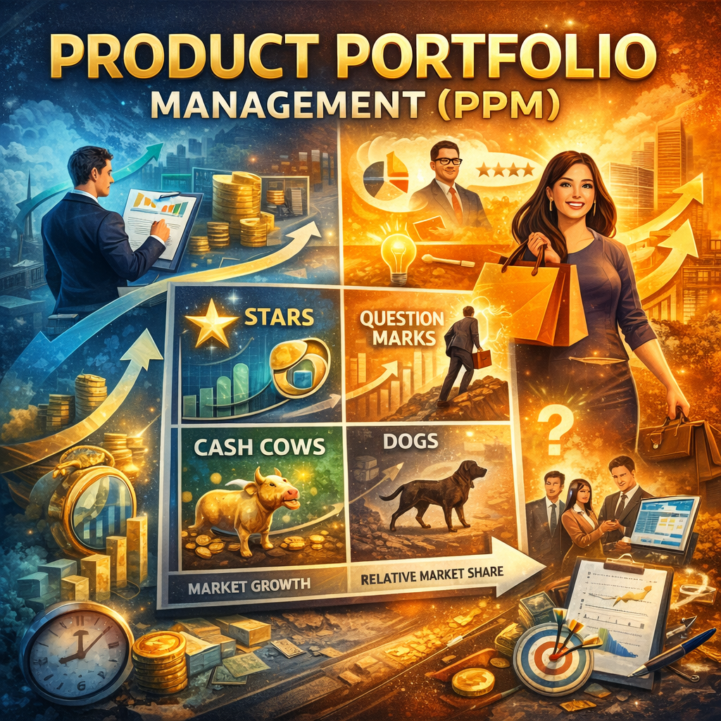 PPMの秀逸さは、各製品の“好き嫌い”や声の大きさで議論する前に、会社としての戦略バランス(成長・収益・リスク)を同じ地図に載せられる点です。BCGの4象限(花形/金のなる木/問題児/負け犬)に代表されるように、象限ごとに「投資」「回収」「実験」「撤退」のルールを置くことで、会議が“評価”で止まらず“配分”まで進みます。