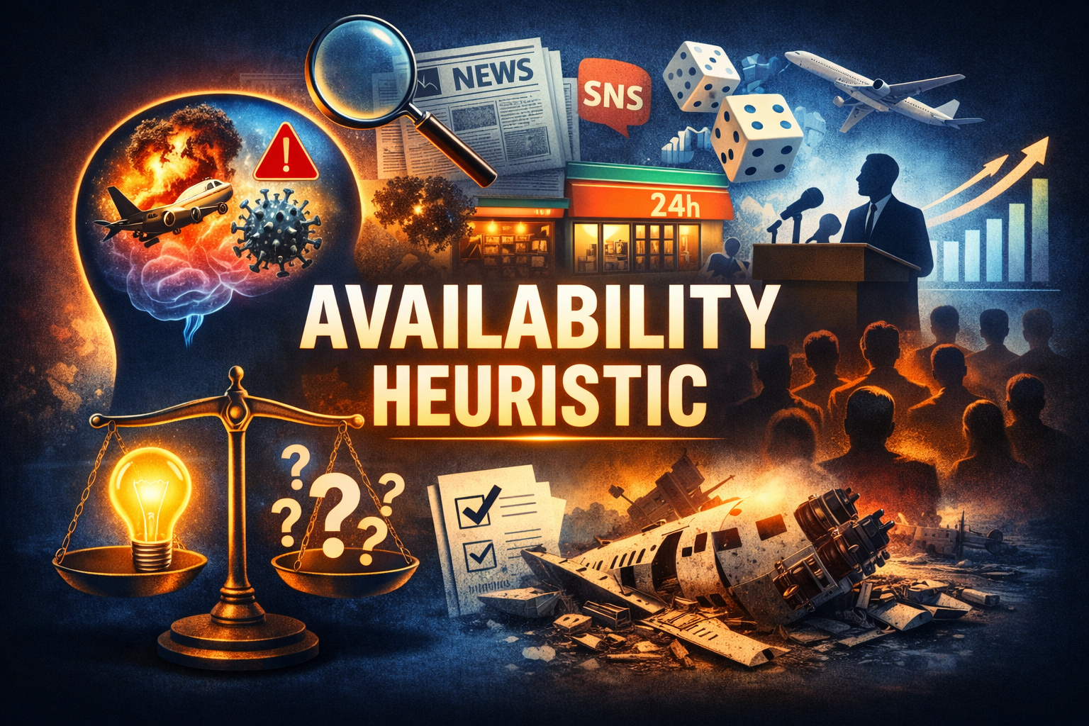 ニュースで何度も見た事件は、実際より頻繁に起きていると感じてしまう――これが利用可能性ヒューリスティック(Availability Heuristic)です。統計ではなく「思い出しやすさ」で確率を判断してしまう、人間の脳のクセと言えます。「意思決定・判断(Decision & Judgment)」の中でも、不確実な状況で“それっぽい答え”を即断する典型パターンとして位置づきます。