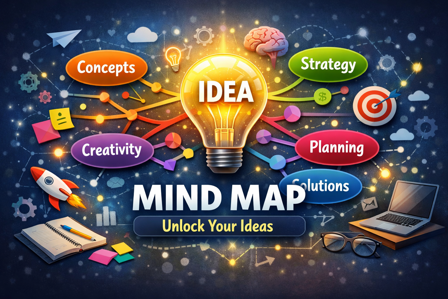 マインドマップとは、中心テーマから連想を放射状に広げ、思考の全体像を一枚の図として可視化する発想・整理ツール。
